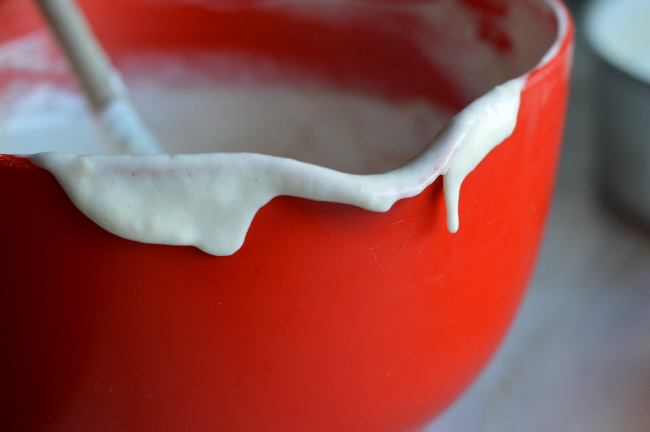 Adiciona-se metade da farinha à mistura do leite, e depois, intervaladamente, a restante farinha e as claras em castelo. Como queremos um bolo muito fofo, envolvam a mistura com cuidado.